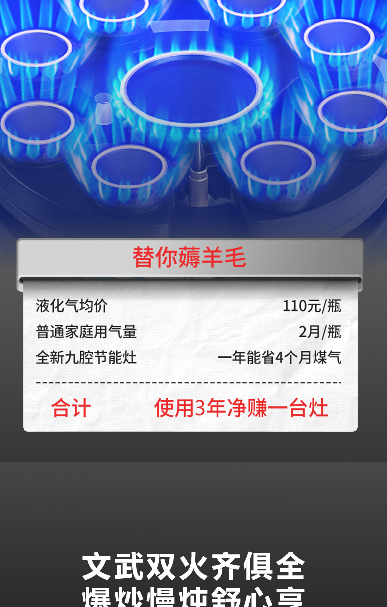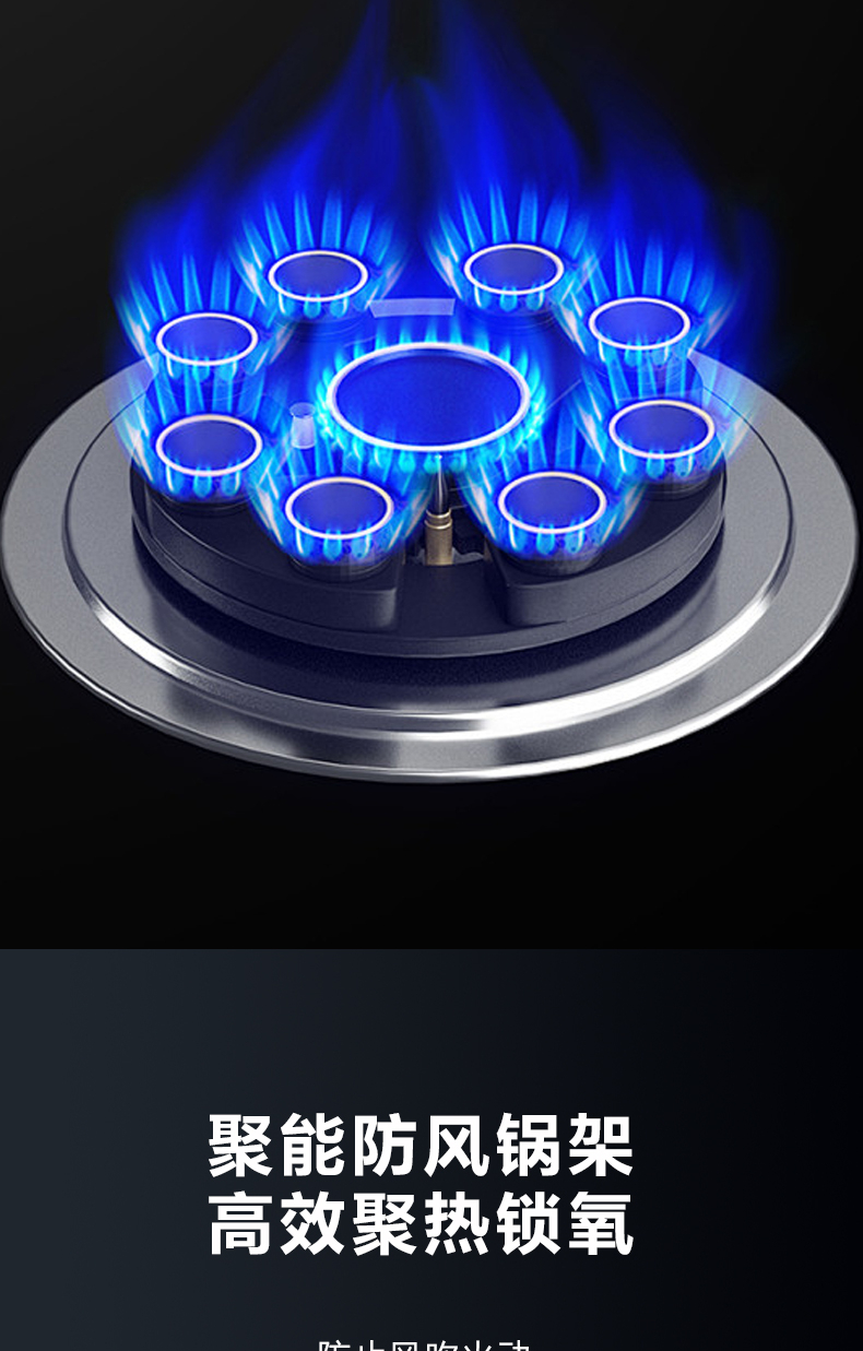5 2kW大火力,九頭猛火灶,63%熱效率,6mm厚鋼化玻璃面板,4層防爆
